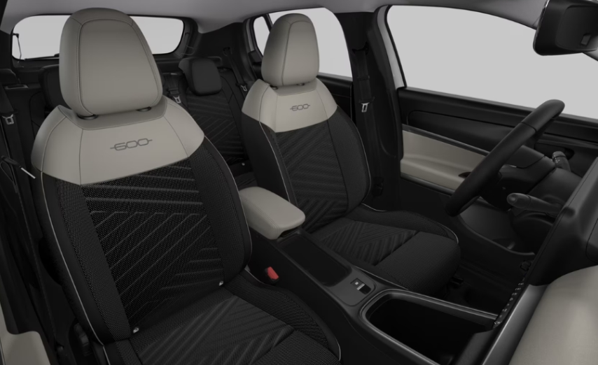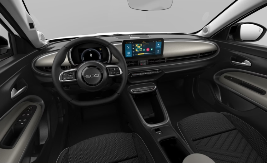 Anello plancia verniciato nero; Fascia plancia grigia; Maniglie interne nero opaco; Selleria bicolore in tessuto nero jaquard con monogramma Fiat